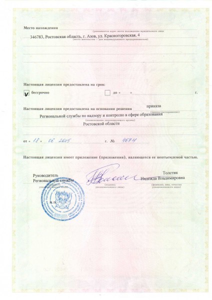 Образовательная деятельность осуществляется по адресу: Ростовская область, г. Азов, ул. Красногоровская, 4